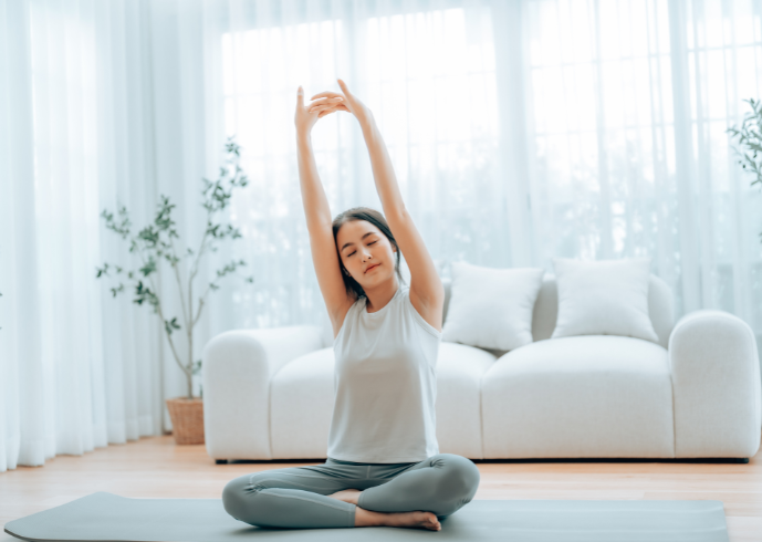 - 息を吸いながら、お尻をゆっくりと床に戻します。